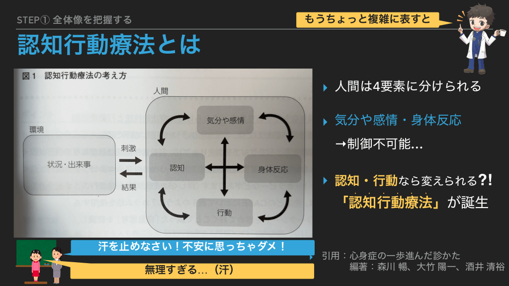 #13. もうちょっと複雑に表すと STEP① 全体像を把握する 認知行動療法とは ▸ 人間は4要素に分けられる ▸ 気分や感情・身体反応 →制御不可能… ▸ 認知・行動なら変えられる⁈ • • • • • • 「認知行動療法」が誕生 汗を止めなさい!不安に思っちゃダメ! 無理すぎる…(汗) ▸ 引用:心身症の一歩進んだ診かた 編著:森川 暢、大竹 陽一、酒井 清裕
