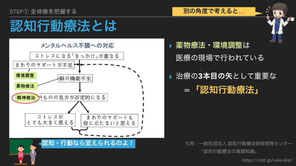 #14. STEP① 全体像を把握する 別の角度で考えると… 認知行動療法とは ▸ 薬物療法・環境調整は 医療の現場で行われている • ▸ 治療の3本目の矢として重要な =「認知行動療法」 認知・行動なら変えられるのよ! 引用:一般社団法人 認知行動療法研修開発センター 「認知行動療法の基礎知識」 https://cbtt.jp/videolist/