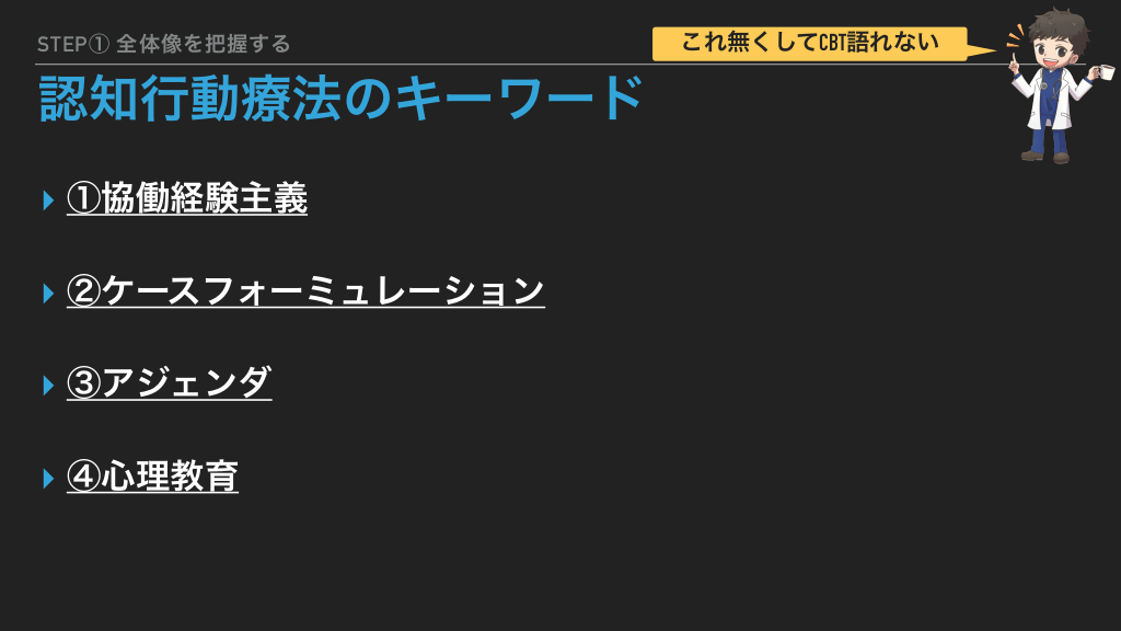 #15. STEP① 全体像を把握する 認知行動療法のキーワード ▸ ①協働経験主義 ▸ ②ケースフォーミュレーション ▸ ③アジェンダ ▸ ④心理教育 これ無くしてCBT語れない