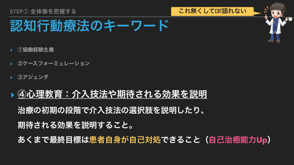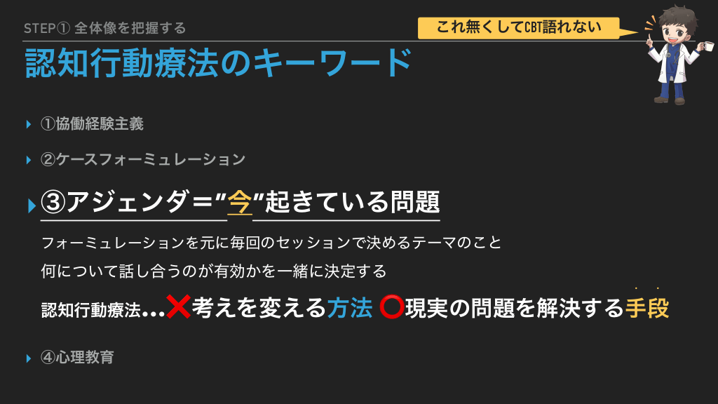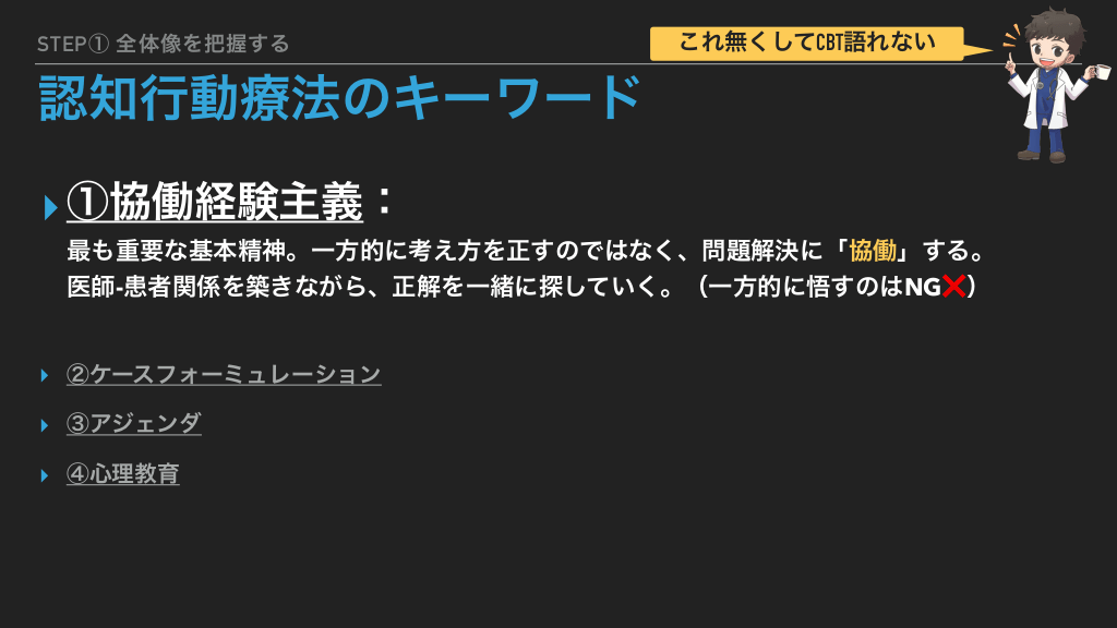#16. STEP① 全体像を把握する これ無くしてCBT語れない 認知行動療法のキーワード ▸ ①協働経験主義: 最も重要な基本精神。一方的に考え方を正すのではなく、問題解決に「協働」する。 医師-患者関係を築きながら、正解を一緒に探していく。(一方的に悟すのはNG❌) ▸ ②ケースフォーミュレーション ▸ ③アジェンダ ▸ ④心理教育