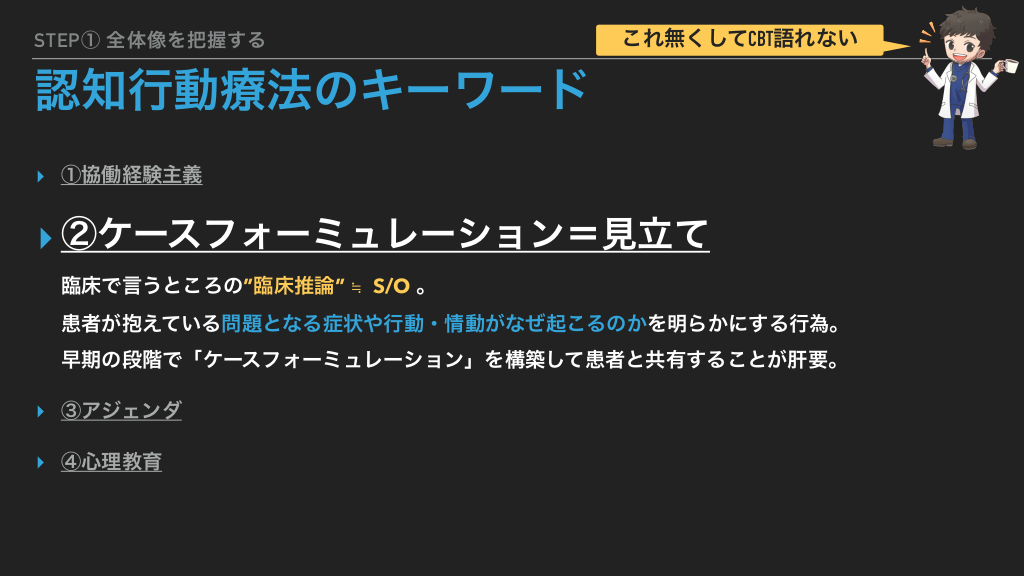 #17. STEP① 全体像を把握する これ無くしてCBT語れない 認知行動療法のキーワード ▸ ①協働経験主義 ▸ ②ケースフォーミュレーション=見立て 臨床で言うところの”臨床推論” ≒ S/O 。 患者が抱えている問題となる症状や行動・情動がなぜ起こるのかを明らかにする行為。 早期の段階で「ケースフォーミュレーション」を構築して患者と共有することが肝要。 ▸ ③アジェンダ ▸ ④心理教育