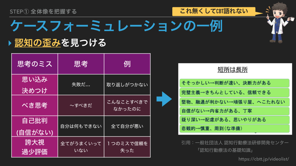 #18. これ無くしてCBT語れない STEP① 全体像を把握する ケースフォーミュレーションの一例 ▸ 認知の歪みを見つける 思考のミス 思い込み 思考 例 失敗だ… 取り返しがつかない 〜すべきだ こんなことすべきで なかったのに 自分は何もできない 全て自分が悪い 全てがうまくいって いない 1つのミスで信頼を 失った 決めつけ べき思考 自己批判 (自信がない) 誇大視 過少評価 引用:一般社団法人 認知行動療法研修開発センター 「認知行動療法の基礎知識」 https://cbtt.jp/videolist/