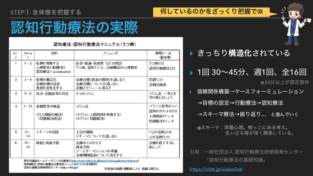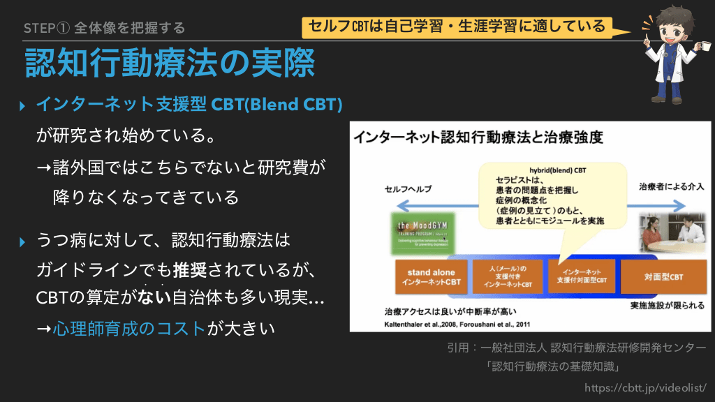 #23. STEP① 全体像を把握する セルフCBTは自己学習・生涯学習に適している 認知行動療法の実際 ▸ インターネット支援型 CBT(Blend CBT) が研究され始めている。 →諸外国ではこちらでないと研究費が 降りなくなってきている ▸ うつ病に対して、認知行動療法は ガイドラインでも推奨されているが、 • • CBTの算定がない自治体も多い現実… →心理師育成のコストが大きい 引用:一般社団法人 認知行動療法研修開発センター 「認知行動療法の基礎知識」 https://cbtt.jp/videolist/