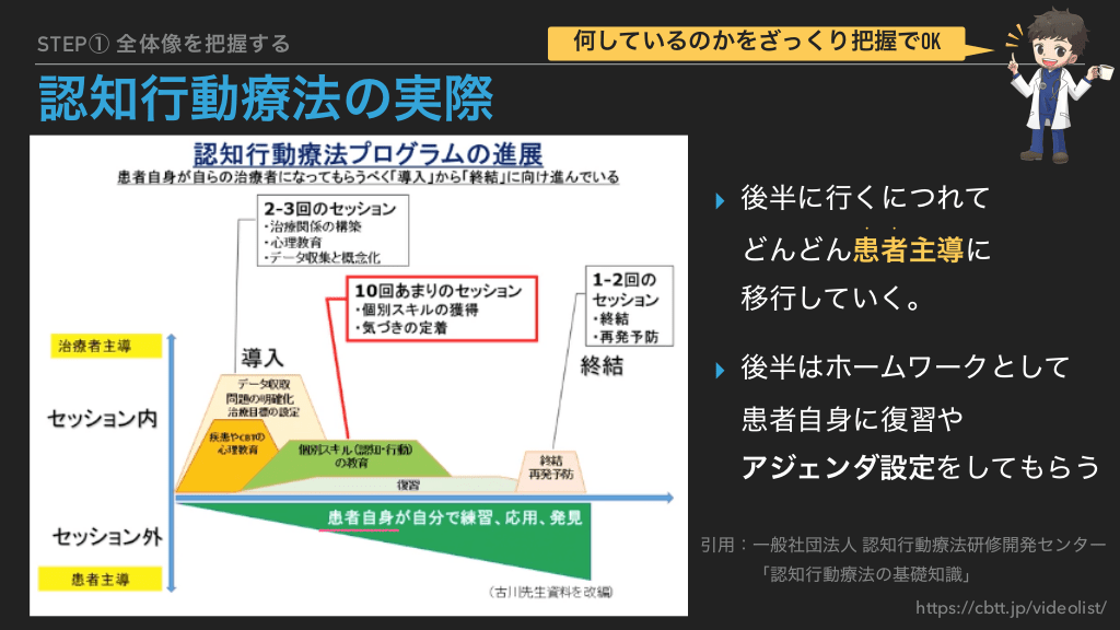 #22. STEP① 全体像を把握する 何しているのかをざっくり把握でOK 認知行動療法の実際 ▸ 後半に行くにつれて • • どんどん患者主導に 移行していく。 ▸ 後半はホームワークとして 患者自身に復習や アジェンダ設定をしてもらう 引用:一般社団法人 認知行動療法研修開発センター 「認知行動療法の基礎知識」 https://cbtt.jp/videolist/