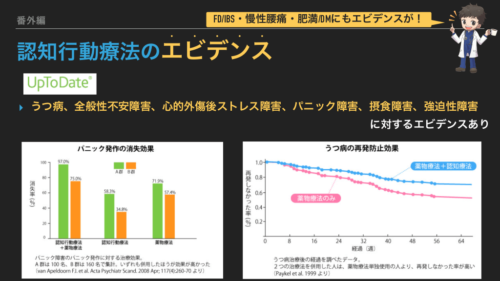 #24. FD/IBS・慢性腰痛・肥満/DMにもエビデンスが! 番外編 • • • • • 認知行動療法のエビデンス ▸ うつ病、全般性不安障害、心的外傷後ストレス障害、パニック障害、摂食障害、強迫性障害 に対するエビデンスあり