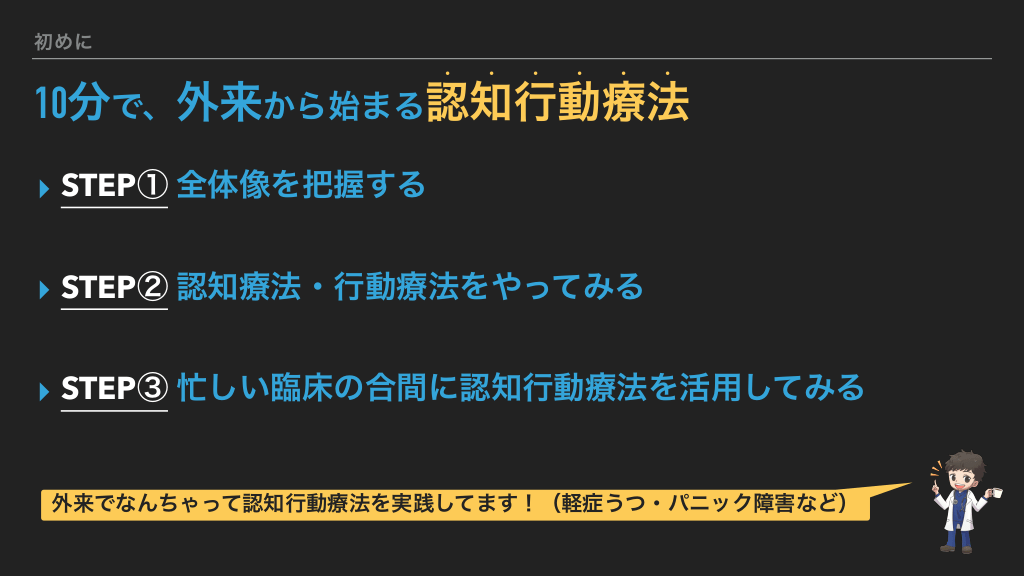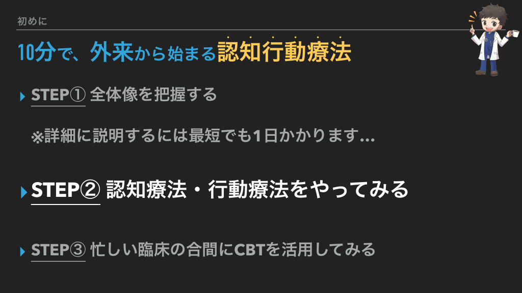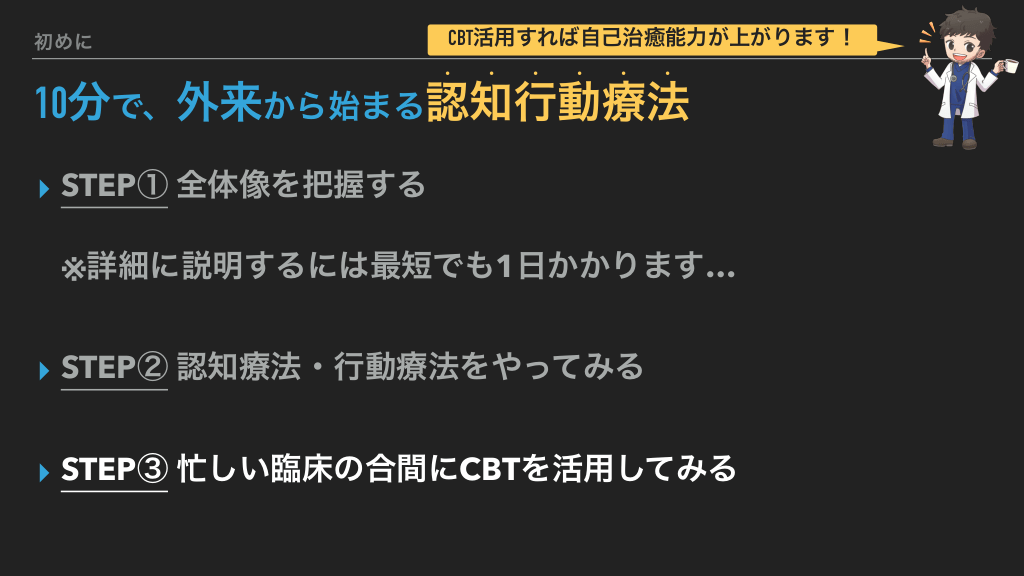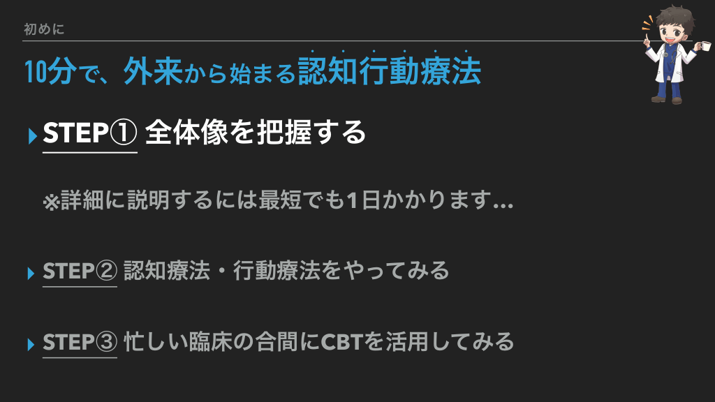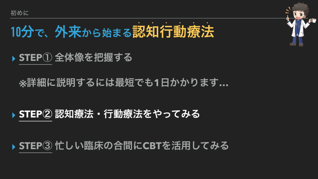 #4. 初めに • • • • • • 10分で、外来から始まる認知行動療法 ▸ STEP① 全体像を把握する ※詳細に説明するには最短でも1日かかります… ▸ STEP② 認知療法・行動療法をやってみる ▸ STEP③ 忙しい臨床の合間にCBTを活用してみる