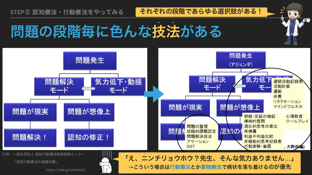 #26. STEP② 認知療法・行動療法をやってみる それぞれの段階であらゆる選択肢がある! • • 問題の段階毎に色んな技法がある 引用:一般社団法人 認知行動療法研修開発センター 「認知行動療法の基礎知識」 https://cbtt.jp/videolist/ • • • 「え、ニンチリョウホウ?先生、そんな気力ありません…」 →こういう場合は行動療法とか薬物療法で病状を落ち着けるのが優先