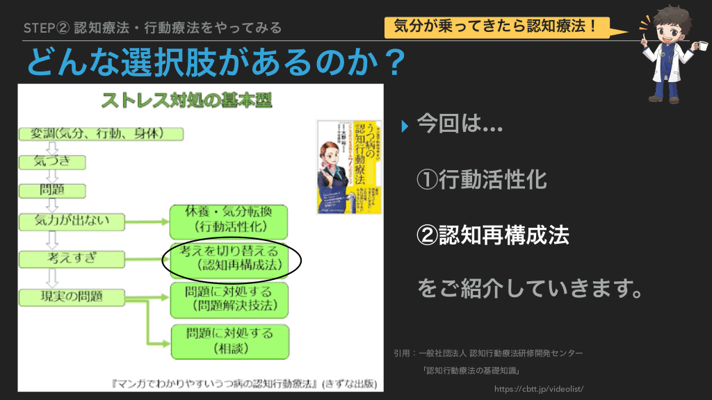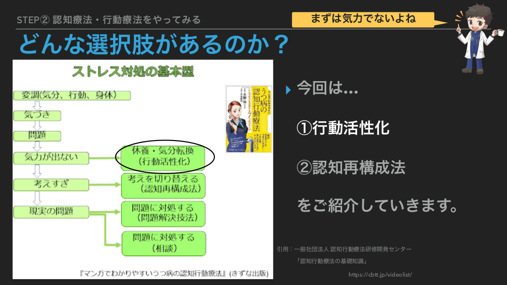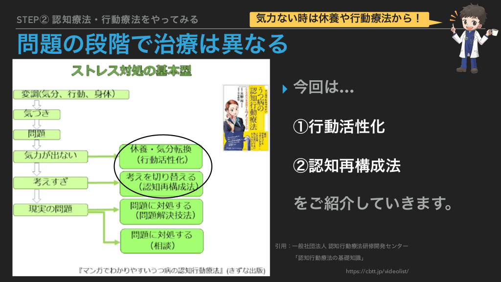 #27. STEP② 認知療法・行動療法をやってみる 気力ない時は休養や行動療法から! 問題の段階で治療は異なる ▸ 今回は… ①行動活性化 ②認知再構成法 をご紹介していきます。 引用:一般社団法人 認知行動療法研修開発センター 「認知行動療法の基礎知識」 https://cbtt.jp/videolist/