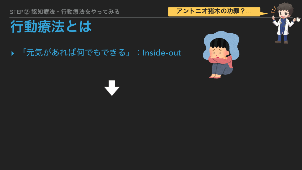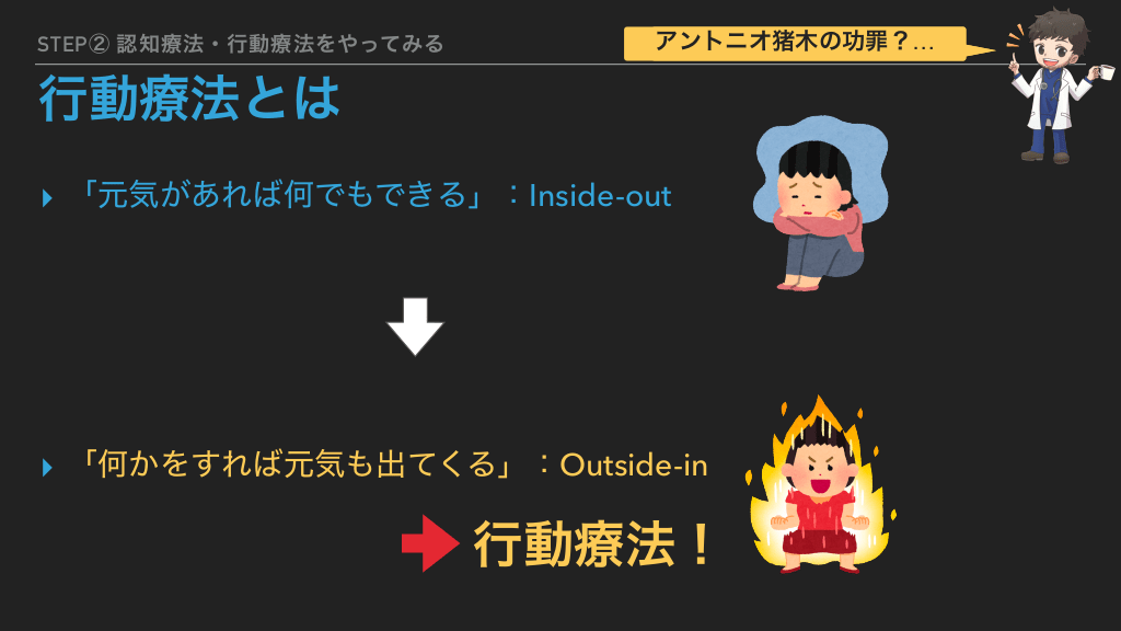 #31. STEP② 認知療法・行動療法をやってみる アントニオ猪木の功罪?… 行動療法とは ▸ 「元気があれば何でもできる」:Inside-out