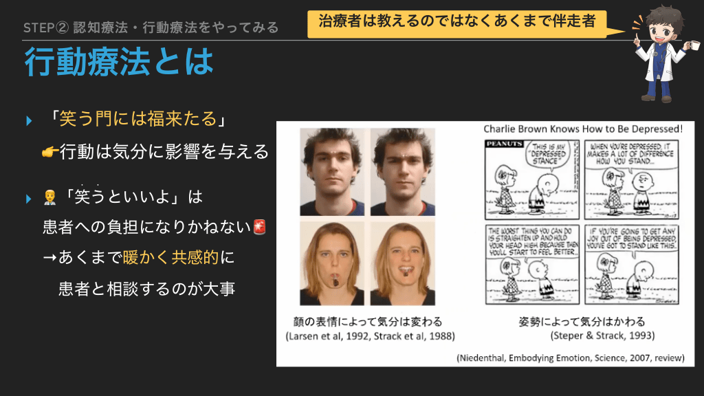#33. STEP② 認知療法・行動療法をやってみる 行動療法とは ▸ 「笑う門には福来たる」 👉行動は気分に影響を与える • • ▸ 👨⚕「笑うといいよ」は 患者への負担になりかねない🚨 →あくまで暖かく共感的に 患者と相談するのが大事 治療者は教えるのではなくあくまで伴走者