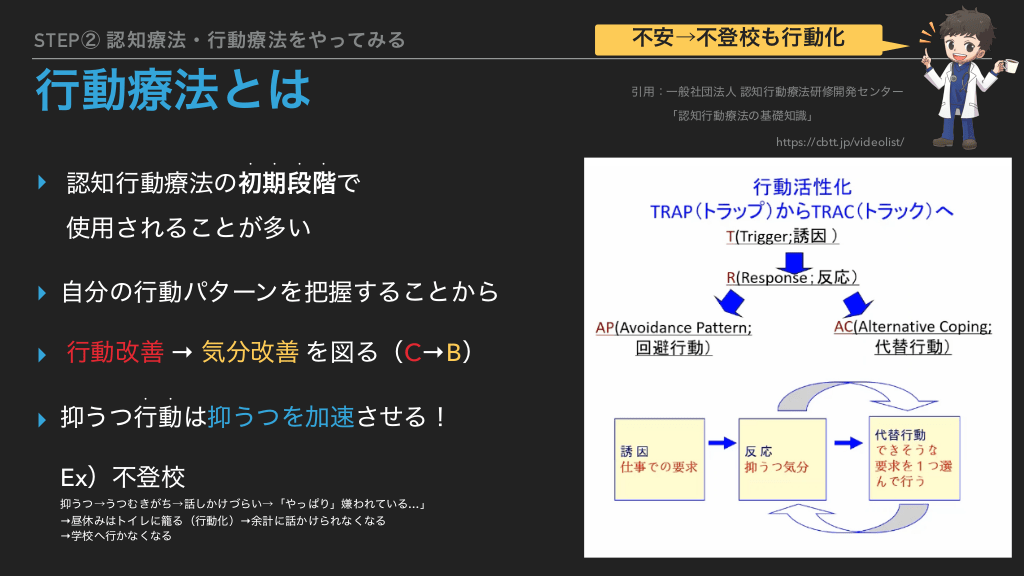 #34. STEP② 認知療法・行動療法をやってみる 不安→不登校も行動化 行動療法とは 引用:一般社団法人 認知行動療法研修開発センター 「認知行動療法の基礎知識」 https://cbtt.jp/videolist/ • • • • ▸ 認知行動療法の初期段階で 使用されることが多い ▸ 自分の行動パターンを把握することから ▸ 行動改善 → 気分改善 を図る(C→B) • • ▸ 抑うつ行動は抑うつを加速させる! Ex)不登校 抑うつ→うつむきがち→話しかけづらい→「やっぱり」嫌われている…」 →昼休みはトイレに籠る(行動化)→余計に話かけられなくなる →学校へ行かなくなる