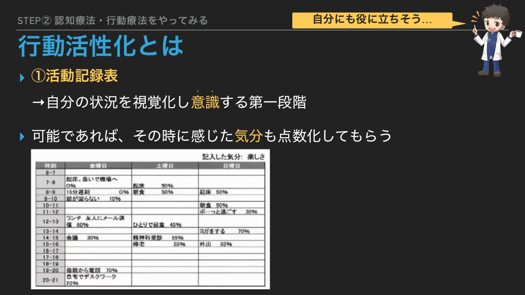 #35. 自分にも役に立ちそう… STEP② 認知療法・行動療法をやってみる 行動活性化とは ▸ ①活動記録表 • • →自分の状況を視覚化し意識する第一段階 ▸ 可能であれば、その時に感じた気分も点数化してもらう