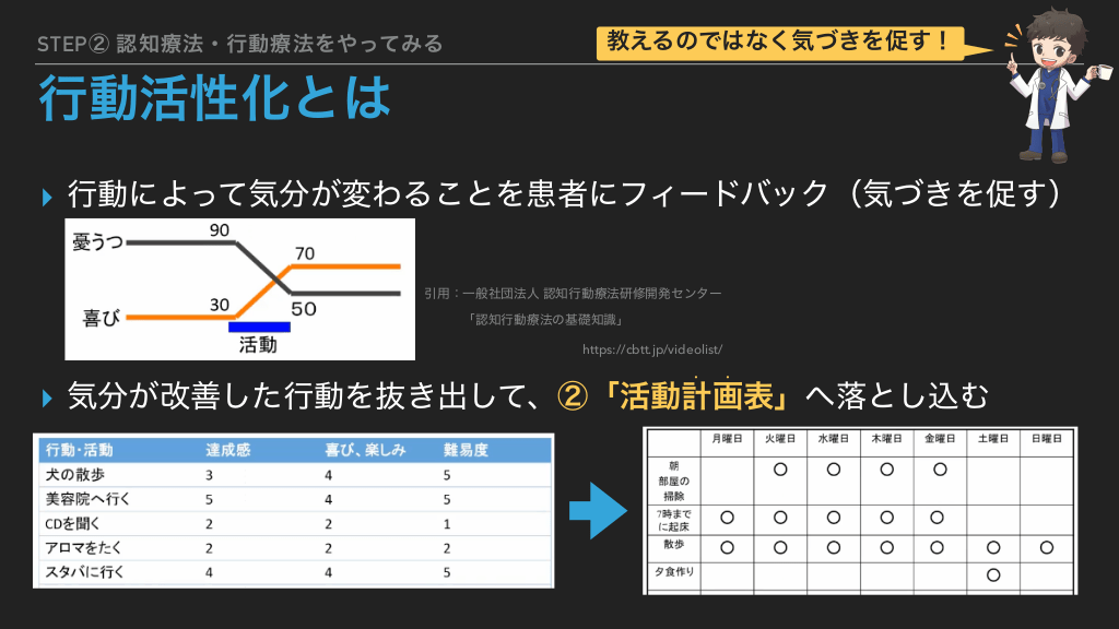 #36. STEP② 認知療法・行動療法をやってみる 教えるのではなく気づきを促す! 行動活性化とは ▸ 行動によって気分が変わることを患者にフィードバック(気づきを促す) 引用:一般社団法人 認知行動療法研修開発センター 「認知行動療法の基礎知識」 https://cbtt.jp/videolist/ • • ▸ 気分が改善した行動を抜き出して、②「活動計画表」へ落とし込む