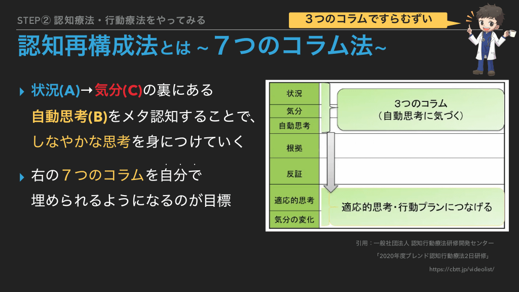 #38. STEP② 認知療法・行動療法をやってみる 3つのコラムですらむずい 認知再構成法とは ~7つのコラム法~ ▸ 状況(A)→気分(C)の裏にある 自動思考(B)をメタ認知することで、 しなやかな思考を身につけていく • • • ▸ 右の7つのコラムを自分で 埋められるようになるのが目標 引用:一般社団法人 認知行動療法研修開発センター 「2020年度ブレンド認知行動療法2日研修」 https://cbtt.jp/videolist/