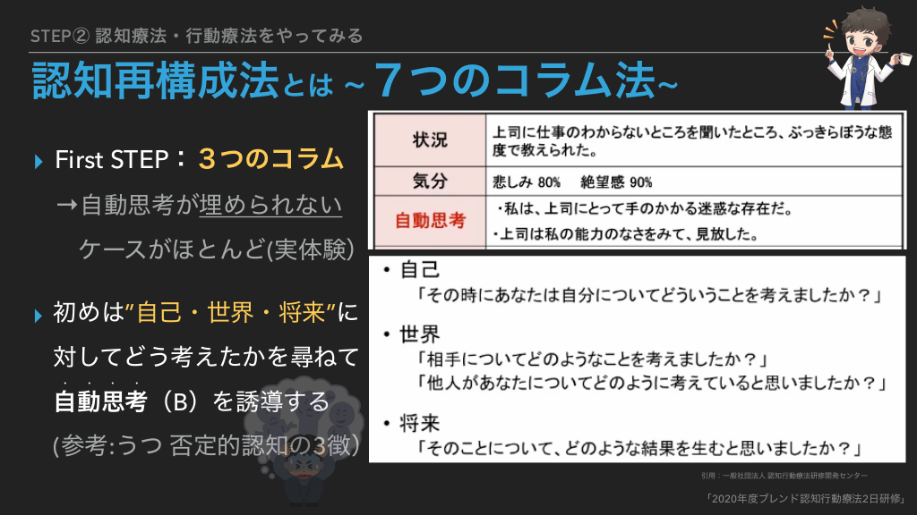 #39. STEP② 認知療法・行動療法をやってみる 認知再構成法とは ~7つのコラム法~ ▸ First STEP:3つのコラム →自動思考が埋められない ケースがほとんど(実体験) ▸ 初めは”自己・世界・将来”に 対してどう考えたかを尋ねて • • • • 自動思考(B)を誘導する (参考:うつ 否定的認知の3徴) 引用:一般社団法人 認知行動療法研修開発センター 「2020年度ブレンド認知行動療法2日研修」