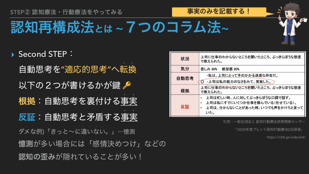 #40. 事実のみを記載する! STEP② 認知療法・行動療法をやってみる 認知再構成法とは ~7つのコラム法~ ▸ Second STEP: • • 自動思考を”適応的思考”へ転換 以下の2つが書けるかが鍵 🔑 • • 根拠:自動思考を裏付ける事実 • • 反証:自動思考と矛盾する事実 • • • • ダメな例)「きっと〜に違いない。」⇦憶測 引用:一般社団法人 認知行動療法研修開発センター 「2020年度ブレンド認知行動療法2日研修」 https://cbtt.jp/videolist/ 憶測が多い場合には「感情決めつけ」などの 認知の歪みが隠れていることが多い!