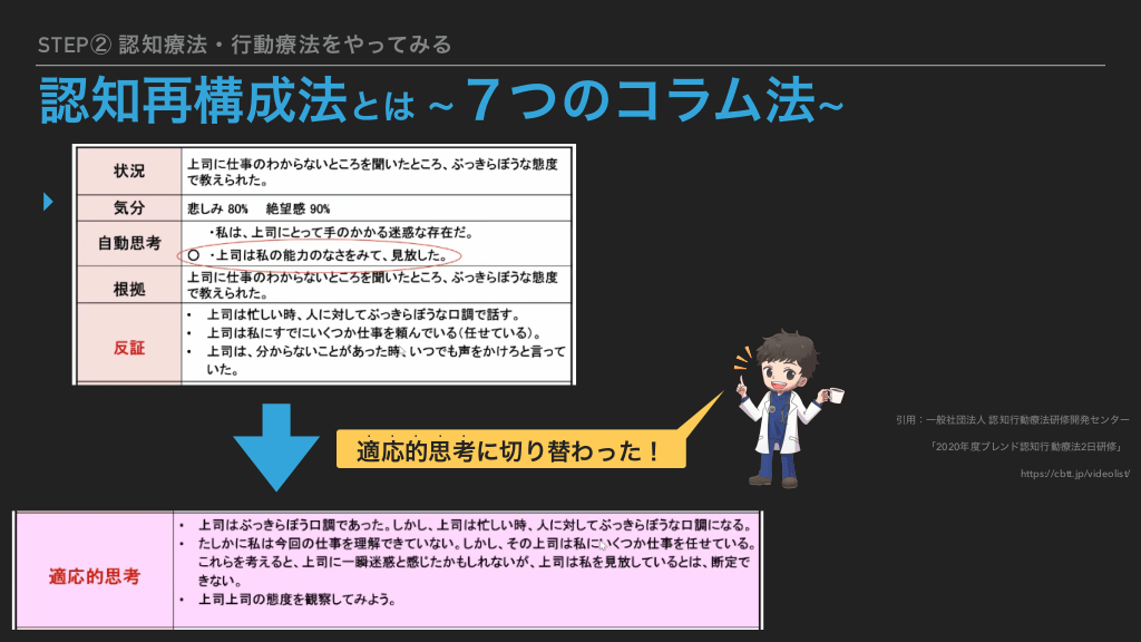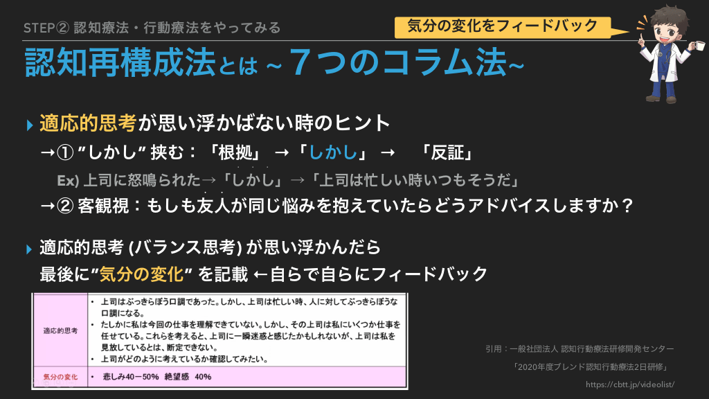 #42. STEP② 認知療法・行動療法をやってみる 気分の変化をフィードバック 認知再構成法とは ~7つのコラム法~ ▸ 適応的思考が思い浮かばない時のヒント →① ”しかし” 挟む:「根拠」 →「しかし」 → • • 「反証」 • Ex) 上司に怒鳴られた→「しかし」→「上司は忙しい時いつもそうだ」 • • →② 客観視:もしも友人が同じ悩みを抱えていたらどうアドバイスしますか? ▸ 適応的思考 (バランス思考) が思い浮かんだら 最後に”気分の変化” を記載 ←自らで自らにフィードバック 引用:一般社団法人 認知行動療法研修開発センター 「2020年度ブレンド認知行動療法2日研修」 https://cbtt.jp/videolist/