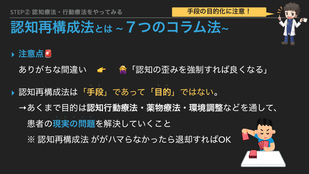 #43. 手段の目的化に注意! STEP② 認知療法・行動療法をやってみる 認知再構成法とは ~7つのコラム法~ ▸ 注意点🚨 👉 ありがちな間違い • • 🙅「認知の歪みを強制すれば良くなる」 • • ▸ 認知再構成法は「手段」であって「目的」ではない。 →あくまで目的は認知行動療法・薬物療法・環境調整などを通して、 • • • • • 患者の現実の問題を解決していくこと ※ 認知再構成法 ががハマらなかったら退却すればOK