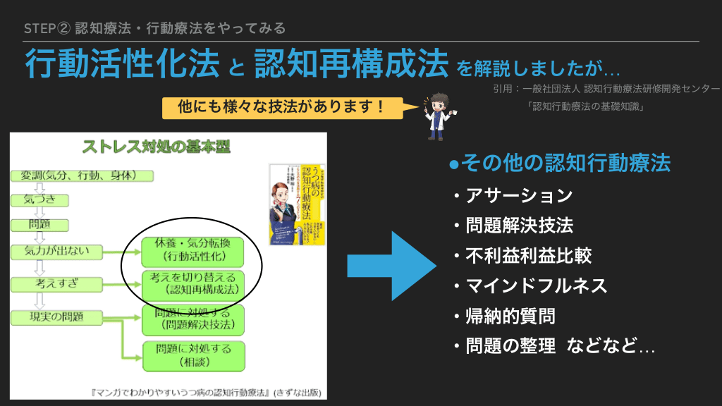 #44. STEP② 認知療法・行動療法をやってみる 行動活性化法 と 認知再構成法 を解説しましたが… 引用:一般社団法人 認知行動療法研修開発センター 他にも様々な技法があります! 「認知行動療法の基礎知識」 ●その他の認知行動療法 ・アサーション ・問題解決技法 ・不利益利益比較 ・マインドフルネス ・帰納的質問 ・問題の整理 などなど…