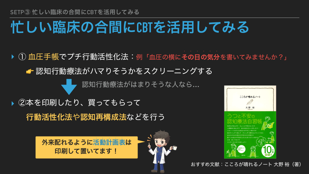 #46. SETP③ 忙しい臨床の合間にCBTを活用してみる 忙しい臨床の合間にCBTを活用してみる • • • • • • ▸ ① 血圧手帳でプチ行動活性化法:例「血圧の横にその日の気分を書いてみませんか?」 👉 認知行動療法がハマりそうかをスクリーニングする 認知行動療法がはまりそうな人なら… ▸ ②本を印刷したり、買ってもらって 行動活性化法や認知再構成法などを行う • • • • • 外来配れるように活動計画表は 印刷して置いてます! おすすめ文献:こころが晴れるノート 大野 裕(著)