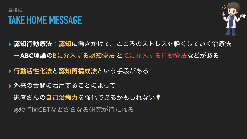 #47. 最後に TAKE HOME MESSAGE ▸ 認知行動療法:認知に働きかけて、こころのストレスを軽くしていく治療法 →ABC理論のBに介入する認知療法 と Cに介入する行動療法などがある ▸ 行動活性化法と認知再構成法という手段がある ▸ 外来の合間に活用することによって 患者さんの自己治癒力を強化できるかもしれない💡 ※短時間CBTなどさらなる研究が待たれる
