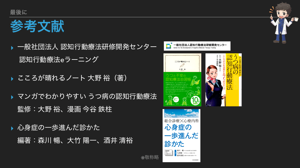 #48. 最後に 参考文献 ▸ 一般社団法人 認知行動療法研修開発センター 認知行動療法eラーニング ▸ こころが晴れるノート 大野 裕(著) ▸ マンガでわかりやすい うつ病の認知行動療法 監修:大野 裕、漫画 今谷 鉄柱 ▸ 心身症の一歩進んだ診かた 編著:森川 暢、大竹 陽一、酒井 清裕 ※敬称略