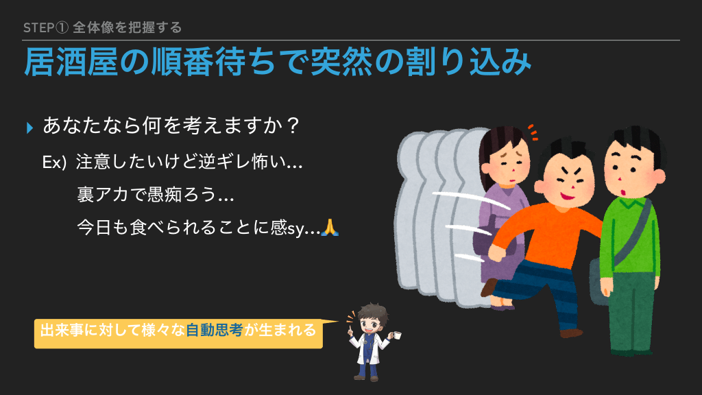 #5. STEP① 全体像を把握する 居酒屋の順番待ちで突然の割り込み ▸ あなたなら何を考えますか? Ex) 注意したいけど逆ギレ怖い… 裏アカで愚痴ろう… 今日も食べられることに感sy…🙏 出来事に対して様々な自動思考が生まれる