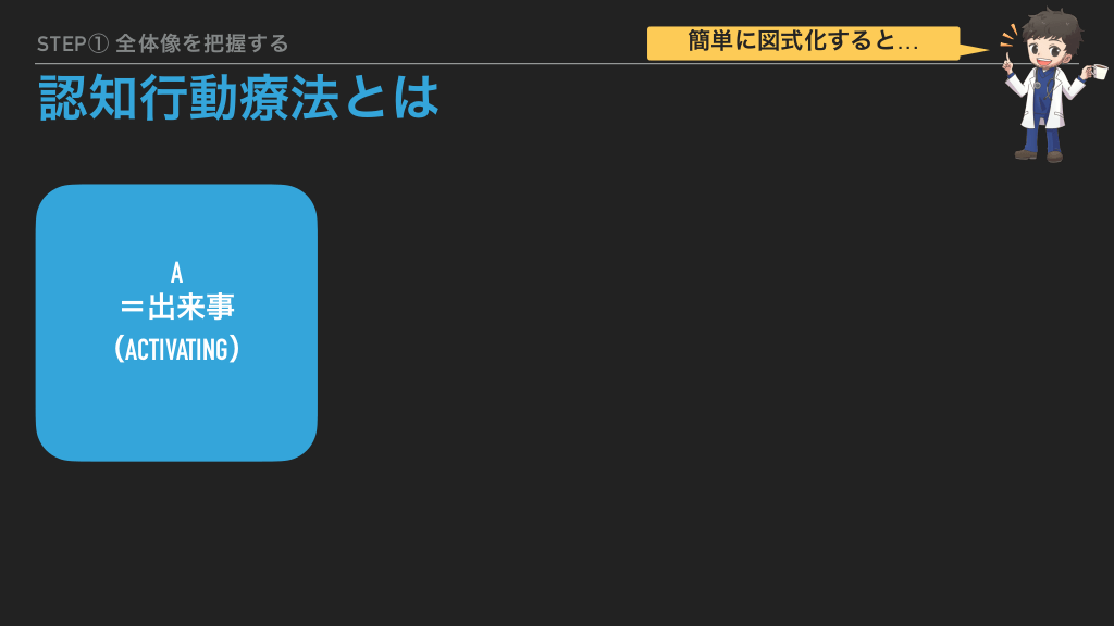 #6. STEP① 全体像を把握する 認知行動療法とは A =出来事 (ACTIVATING) 簡単に図式化すると…