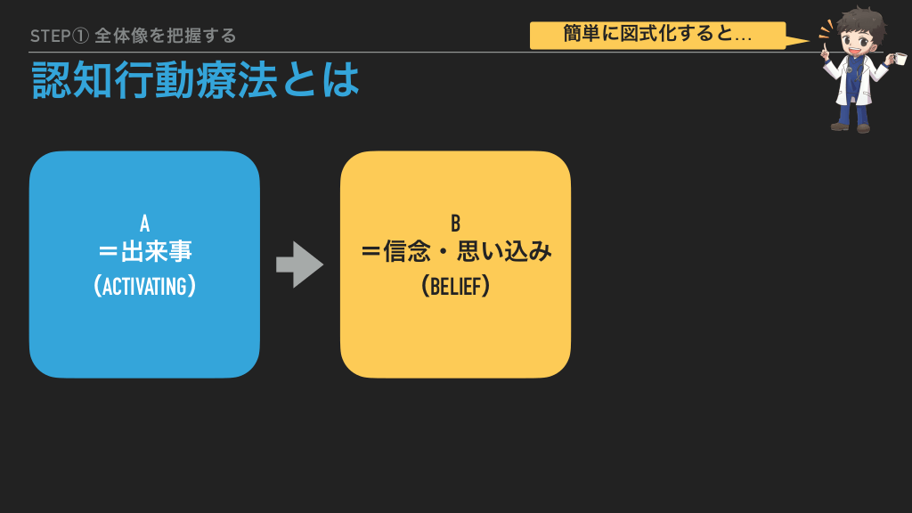 #7. 簡単に図式化すると… STEP① 全体像を把握する 認知行動療法とは ▸ A =出来事 (ACTIVATING) B =信念・思い込み (BELIEF)