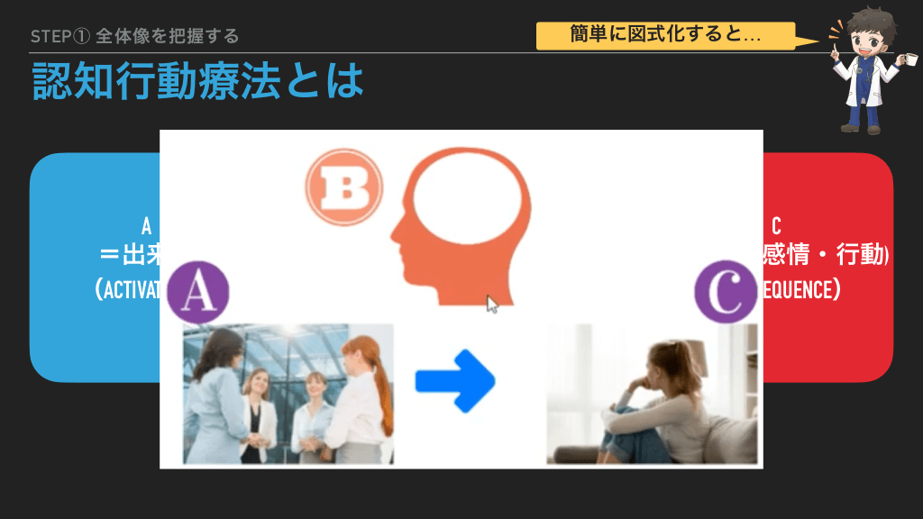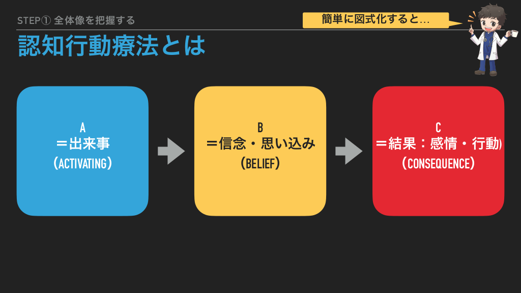 #9. 簡単に図式化すると… STEP① 全体像を把握する 認知行動療法とは ▸ A =出来事 (ACTIVATING) B =信念・思い込み (BELIEF) C =結果:感情・行動) (CONSEQUENCE)
