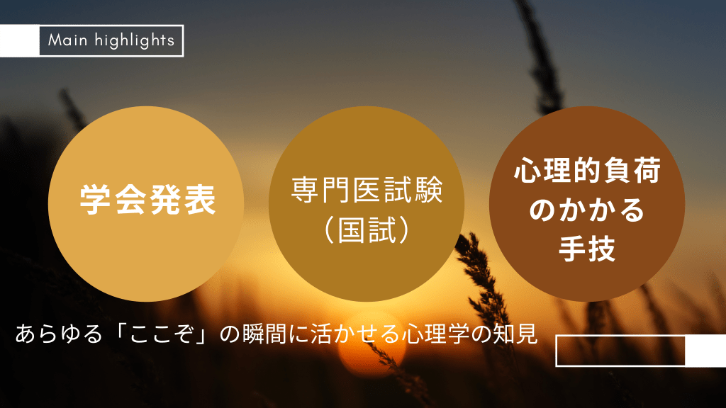 #2. Main highlights 学会発表 専門医試験 (国試) 心理的負荷 のかかる 手技 あらゆる「ここぞ」の瞬間に活かせる心理学の知見