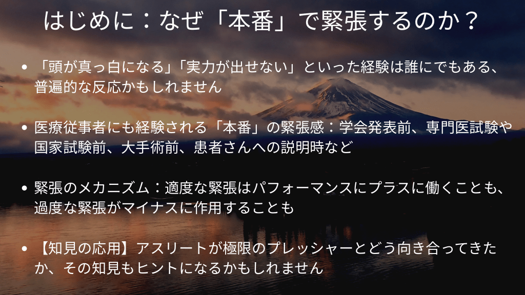 #3. はじめに:なぜ「本番」で緊張するのか? 「頭が真っ白になる」「実力が出せない」といった経験は誰にでもある、 普遍的な反応かもしれません 医療従事者にも経験される「本番」の緊張感:学会発表前、専門医試験や 国家試験前、大手術前、患者さんへの説明時など 緊張のメカニズム:適度な緊張はパフォーマンスにプラスに働くことも、 過度な緊張がマイナスに作用することも 【知見の応用】アスリートが極限のプレッシャーとどう向き合ってきた か、その知見もヒントになるかもしれません