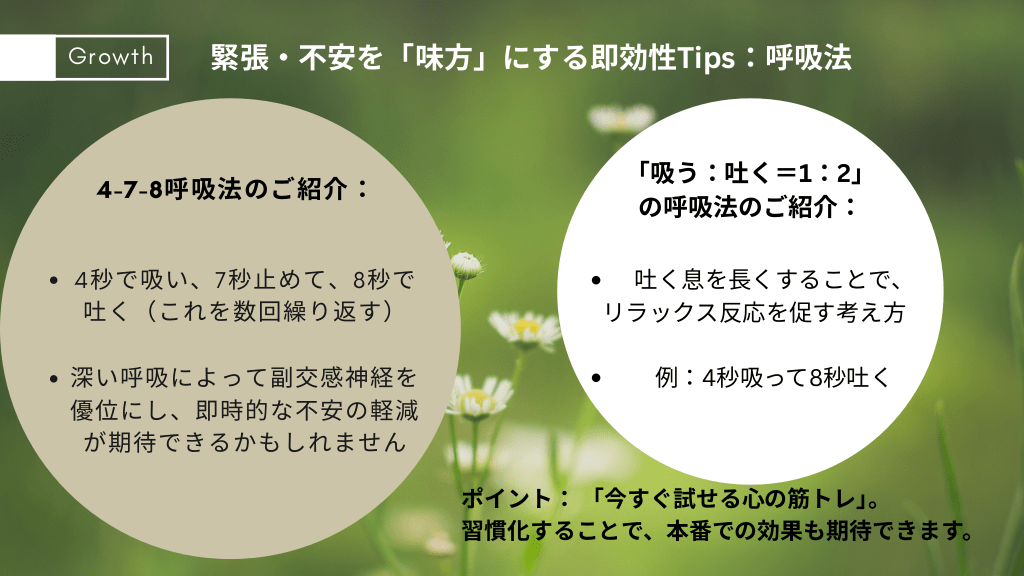 #4. Growth 4-7-8 緊張・不安を「味方」にする即効性Tips:呼吸法 呼吸法のご紹介: 秒で吸い、 7 秒止めて、 8 秒で 吐く(これを数回繰り返す) 深い呼吸によって副交感神経を 優位にし、即時的な不安の軽減 が期待できるかもしれません 4 「吸う:吐く=1:2」 の呼吸法のご紹介: 吐く息を長くすることで、 リラックス反応を促す考え方 例:4秒吸って8秒吐く ポイント: 「今すぐ試せる心の筋トレ」。 習慣化することで、本番での効果も期待できます。