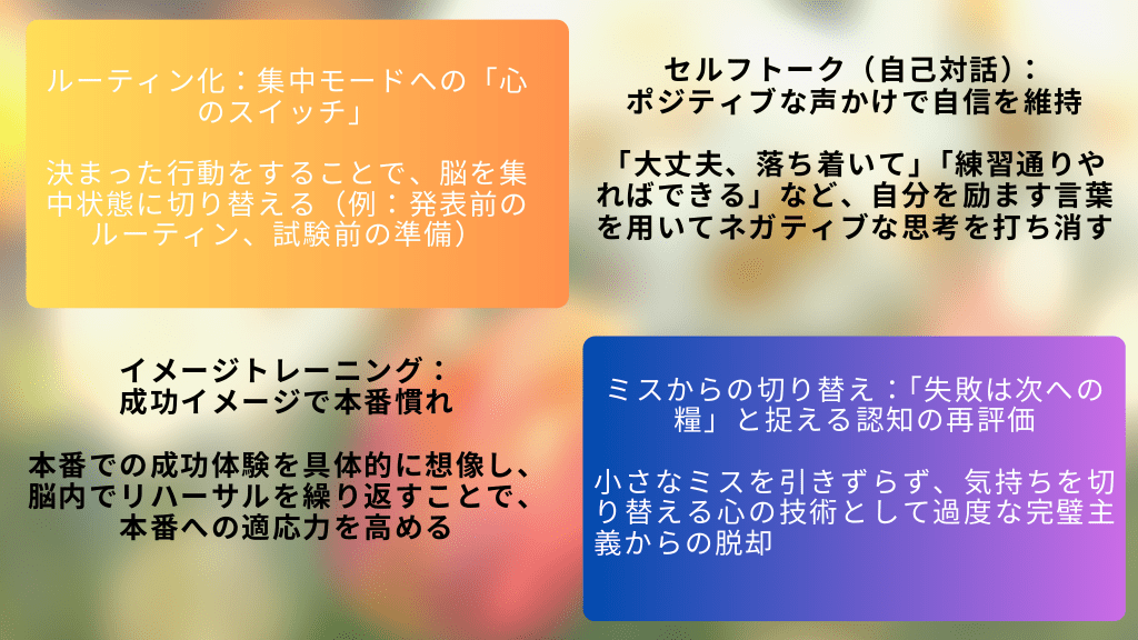 #5. ルーティン化:集中モードへの「心 のスイッチ」 決まった行動をすることで、脳を集 中状態に切り替える(例:発表前の ルーティン、試験前の準備) セルフトーク(自己対話): ポジティブな声かけで自信を維持 「大丈夫、落ち着いて」「練習通りや ればできる」など、自分を励ます言葉 を用いてネガティブな思考を打ち消す イメージトレーニング: ミスからの切り替え: 「失敗は次への 成功イメージで本番慣れ 糧」と捉える認知の再評価 本番での成功体験を具体的に想像し、 小さなミスを引きずらず、気持ちを切 脳内でリハーサルを繰り返すことで、 り替える心の技術として過度な完璧主 本番への適応力を高める 義からの脱却