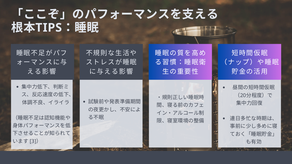 #6. 「ここぞ」のパフォーマンスを支える 根本TIPS:睡眠 睡眠不足がパフ ォーマンスに与 える影響 集中力低下、判断ミ ス、反応速度の低下、 体調不良、イライラ (睡眠不足は認知機能や 身体パフォーマンスを低 下させることが知られて います [3]) 不規則な生活や ストレスが睡眠 に与える影響 試験前や発表準備期間 の夜更かし、不安によ る不眠 睡眠の質を高め る習慣:睡眠衛 生の重要性 ・規則正しい睡眠時 間、寝る前のカフェ イン・アルコール制 限、寝室環境の整備 短時間仮眠 (ナップ)や睡眠 貯金の活用 昼間の短時間仮眠 (20分程度)で 集中力回復 連日多忙な時期は、 事前に少し多めに寝 ておく「睡眠貯金」 も有効