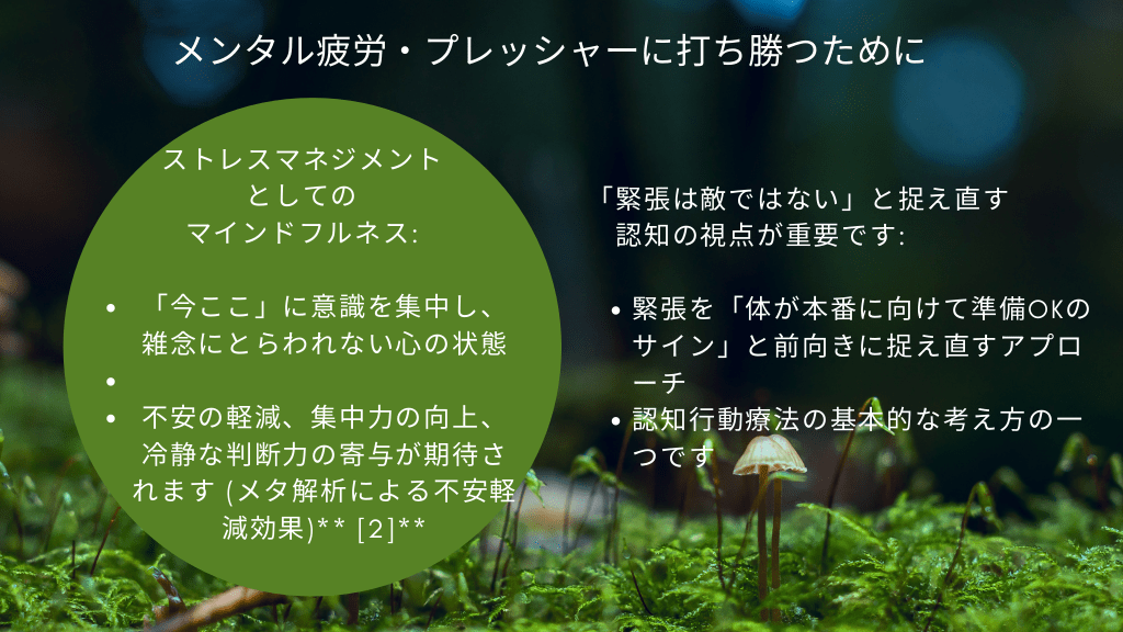 #7. メンタル疲労・プレッシャーに打ち勝つために ストレスマネジメント としての マインドフルネス : 「今ここ」に意識を集中し、 雑念にとらわれない心の状態 不安の軽減、集中力の向上、 冷静な判断力の寄与が期待さ れます ( メタ解析による不安軽 減効果 )** [2]** 「緊張は敵ではない」と捉え直す 認知の視点が重要です : 緊張を「体が本番に向けて準備 OK の サイン」と前向きに捉え直すアプロ ーチ 認知行動療法の基本的な考え方の一 つです