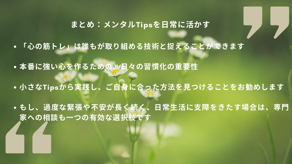 #8. まとめ:メンタル Tips を日常に活かす 「心の筋トレ」は誰もが取り組める技術と捉えることができます 本番に強い心を作るための、日々の習慣化の重要性 小さな Tips から実践し、ご自身に合った方法を見つけることをお勧めします もし、過度な緊張や不安が長く続く、日常生活に支障をきたす場合は、専門 家への相談も一つの有効な選択肢です