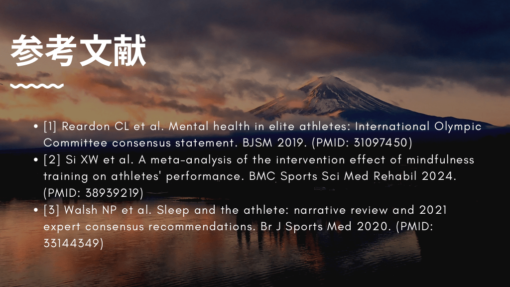 #9. 参考文献 [1] Reardon CL et al. Mental health in elite athletes: International Olympic Committee consensus statement. BJSM 2019. (PMID: 31097450) [2] Si XW et al. A meta-analysis of the intervention effect of mindfulness training on athletes' performance. BMC Sports Sci Med Rehabil 2024. (PMID: 38939219) [3] Walsh NP et al. Sleep and the athlete: narrative review and 2021 expert consensus recommendations. Br J Sports Med 2020. (PMID: 33144349)
