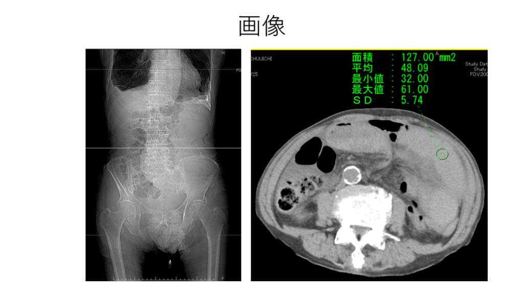 (正常腸液であれば0-15HU程度、20-40HUだと出血の可能性あり)