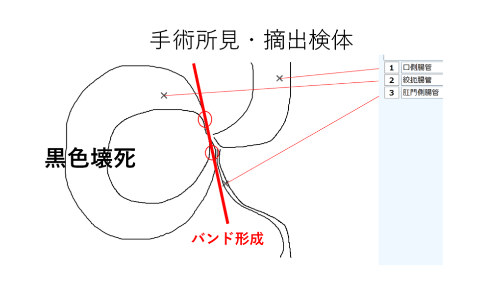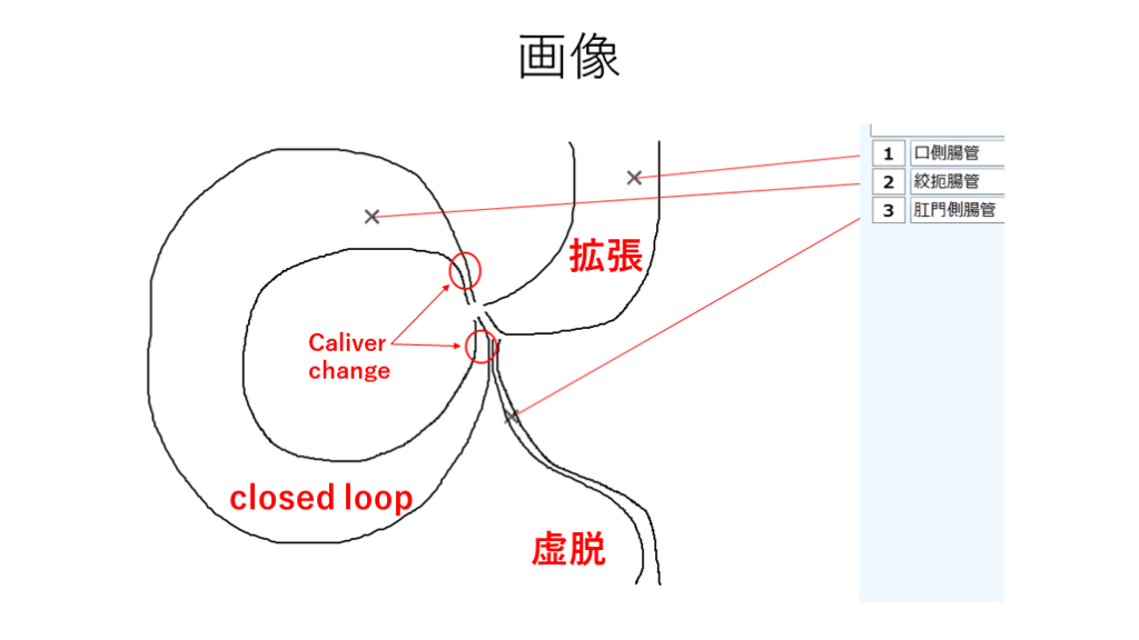 ・腸管の先細り像(caliver change)を2つ見つければ絞扼起点が近い。