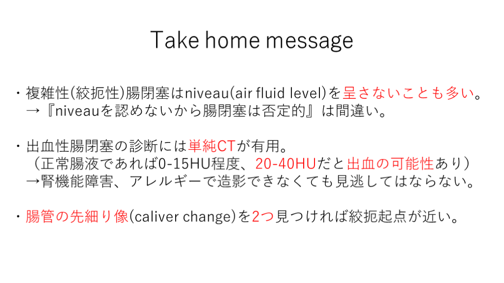 #11. Take home message ・複雑性(絞扼性)腸閉塞はniveau(air fluid level)を呈さないことも多い。