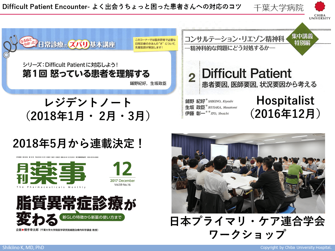 新撰医チバ代表 Shikiino K, MD, PhD Difficult Patient Encounter- よく出会うちょっと困った患者さんへの対応のコツ 鋪野 紀好
