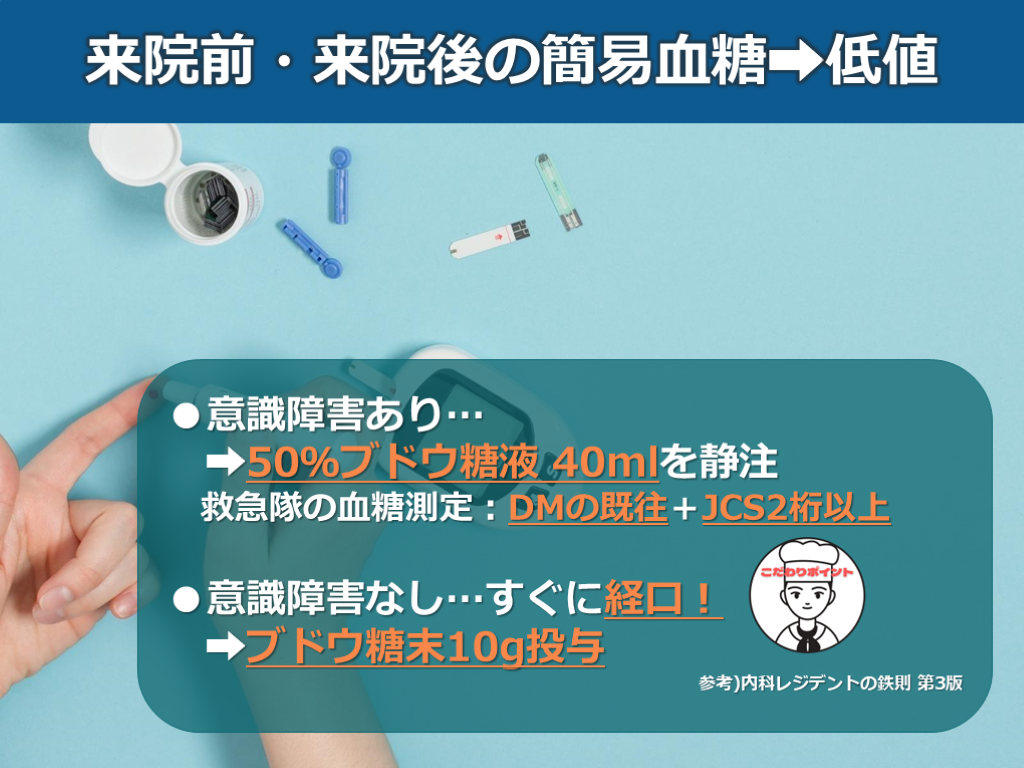 #5. 来院前・来院後の簡易血糖➡低値 ●意識障害あり…