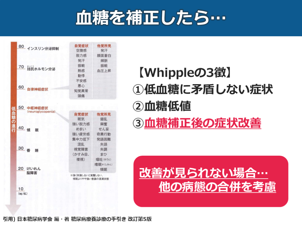 #7. 血糖を補正したら… 引用) 日本糖尿病学会 編・著 糖尿病療養診療の手引き 改訂第5版 【Whippleの3徴】