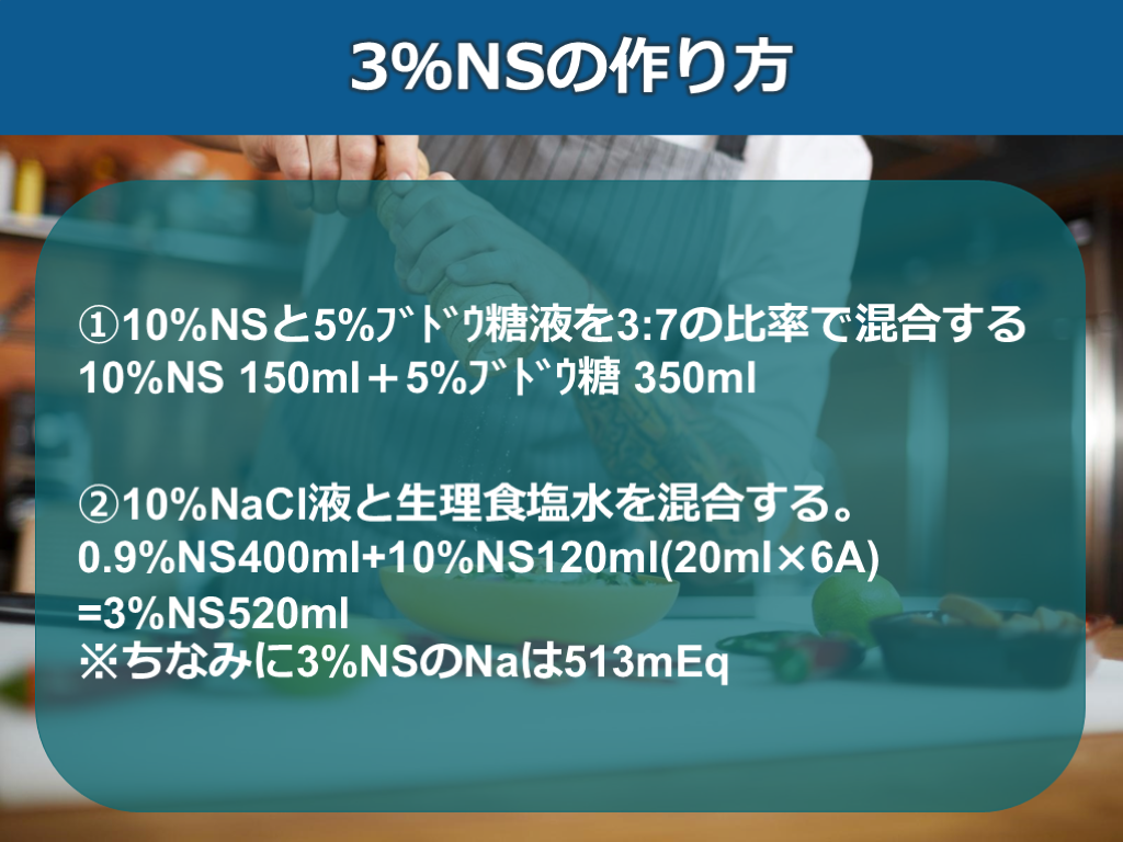 ②10%NaCl液と生理食塩水を混合する。0.9%NS400ml+10%NS120ml(20ml×6A)=3%NS520ml※ちなみに3%NSのNaは513mEq