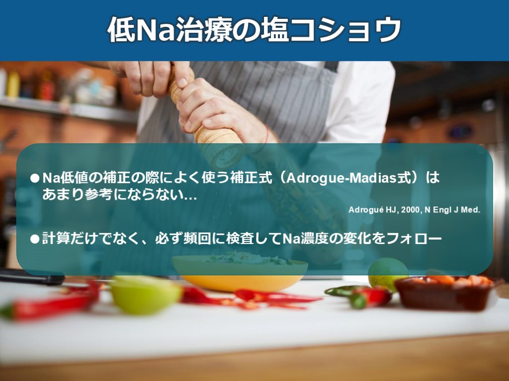 #21. 低Na治療の塩コショウ ●Na低値の補正の際によく使う補正式(Adrogue-Madias式)は