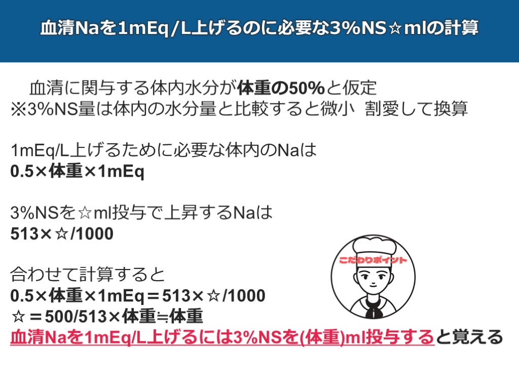 合わせて計算すると0.5×体重×1mEq=513×☆/1000☆=500/513×体重≒体重血清Naを1mEq/L上げるには3%NSを(体重)ml投与すると覚える