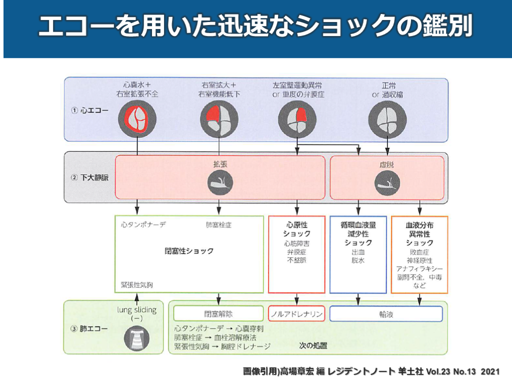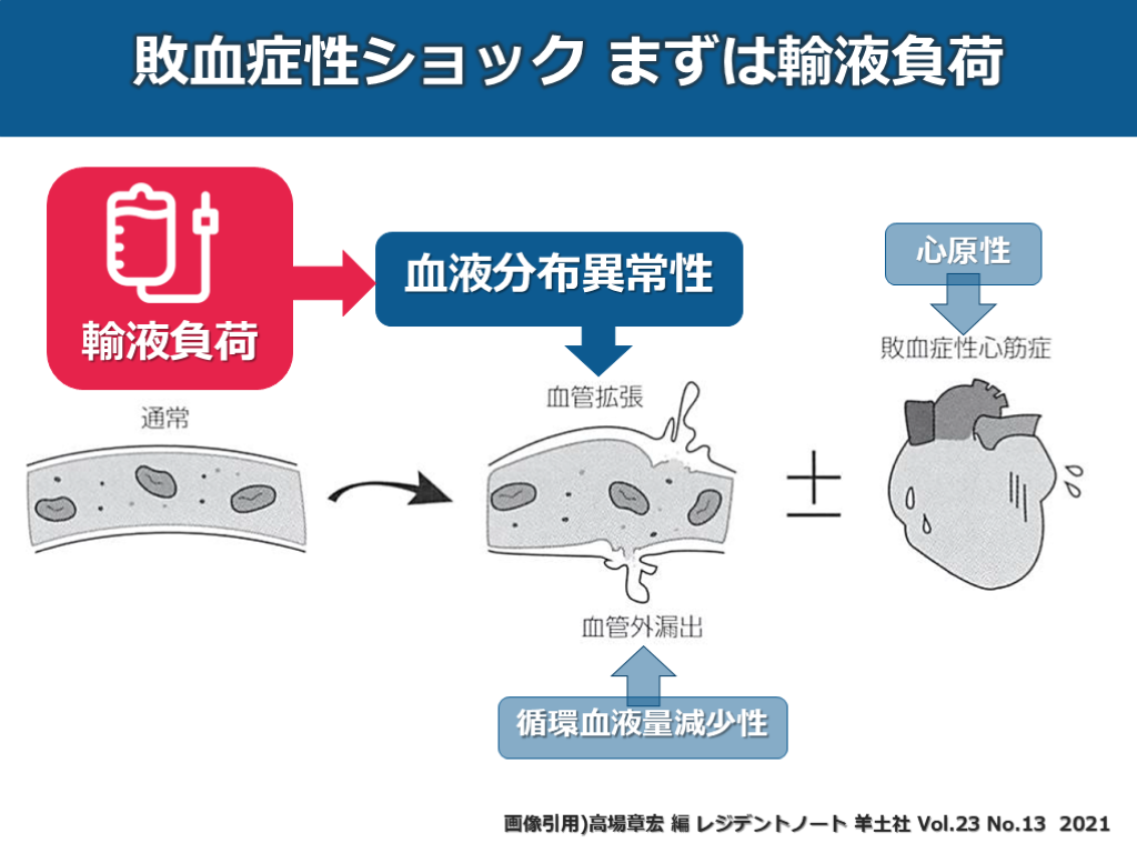 #44. 敗血症性ショック まずは輸液負荷 画像引用)高場章宏 編 レジデントノート 羊土社 Vol.23 No.13 2021 心原性 血液分布異常性 循環血液量減少性 輸液負荷