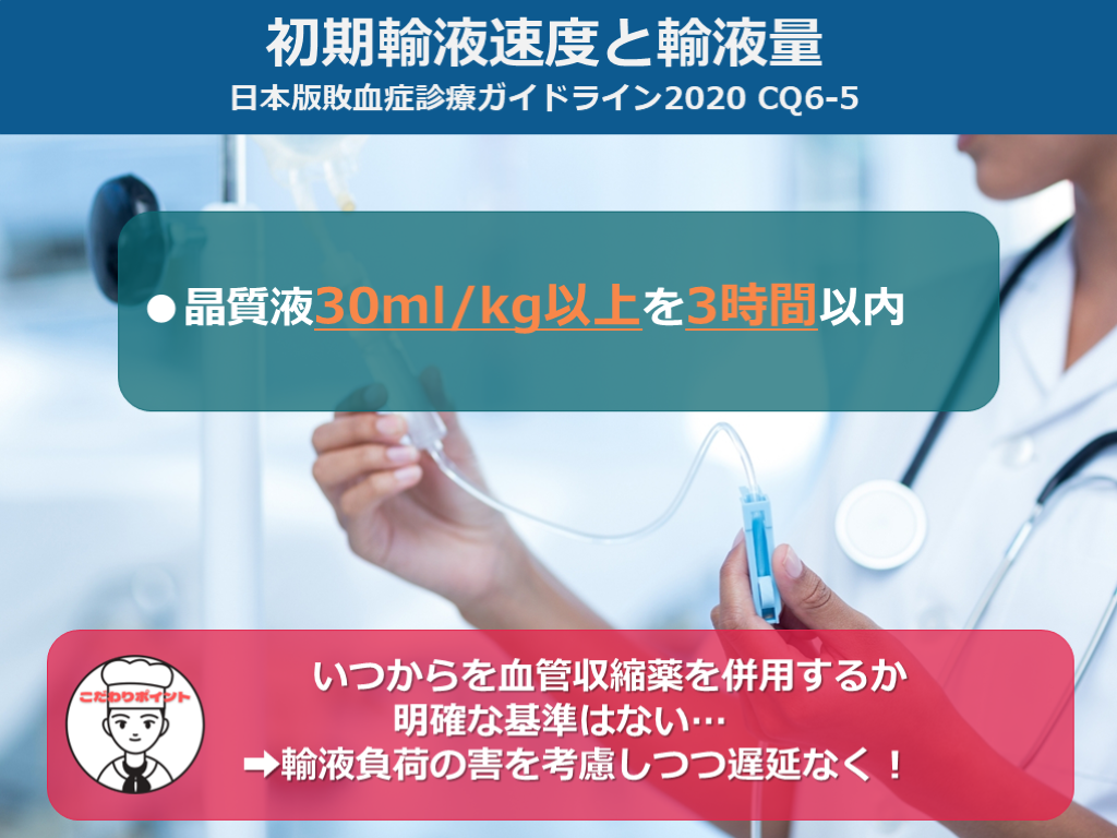 日本版敗血症診療ガイドライン2020 CQ6-5 ●晶質液30ml/kg以上を3時間以内 いつからを血管収縮薬を併用するか
