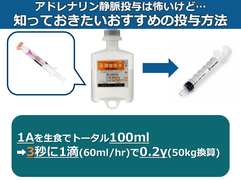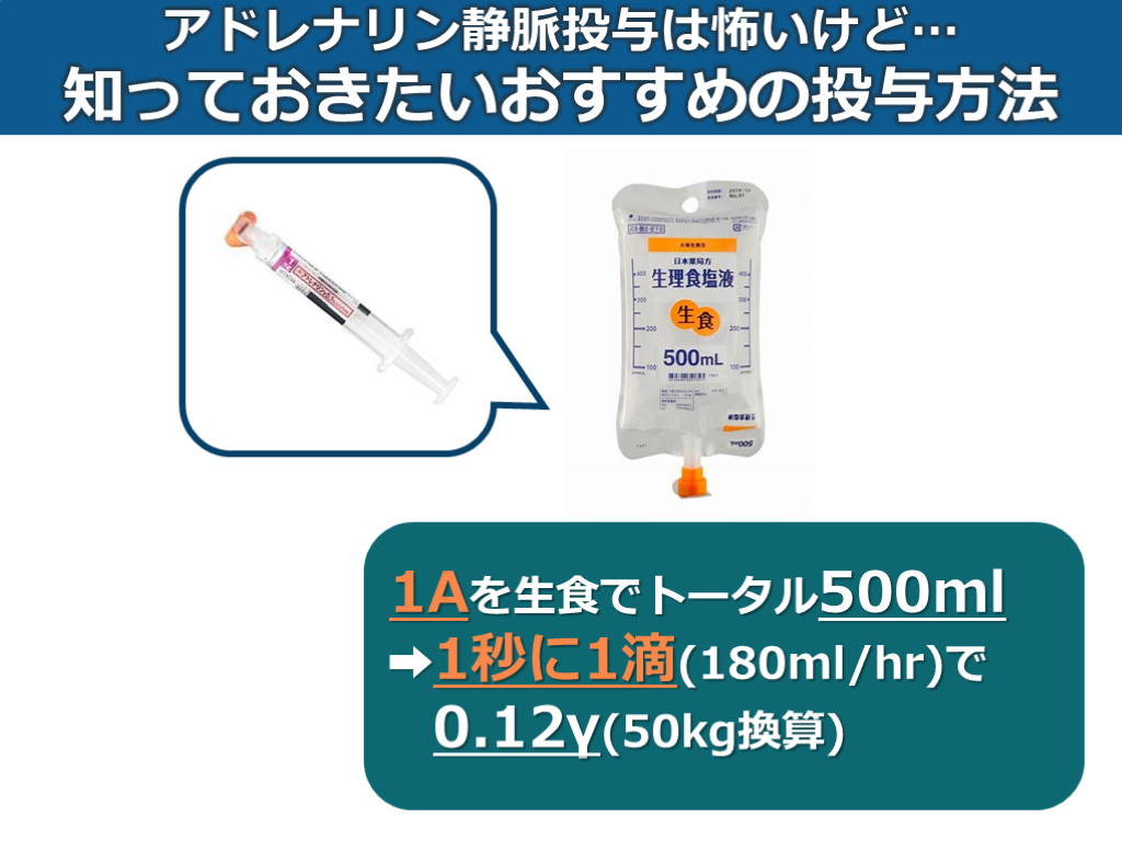 ➡3秒に1滴(60ml/hr)で0.2γ(50kg換算) アドレナリン静脈投与は怖いけど…